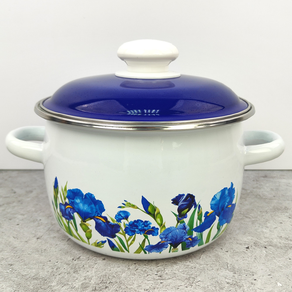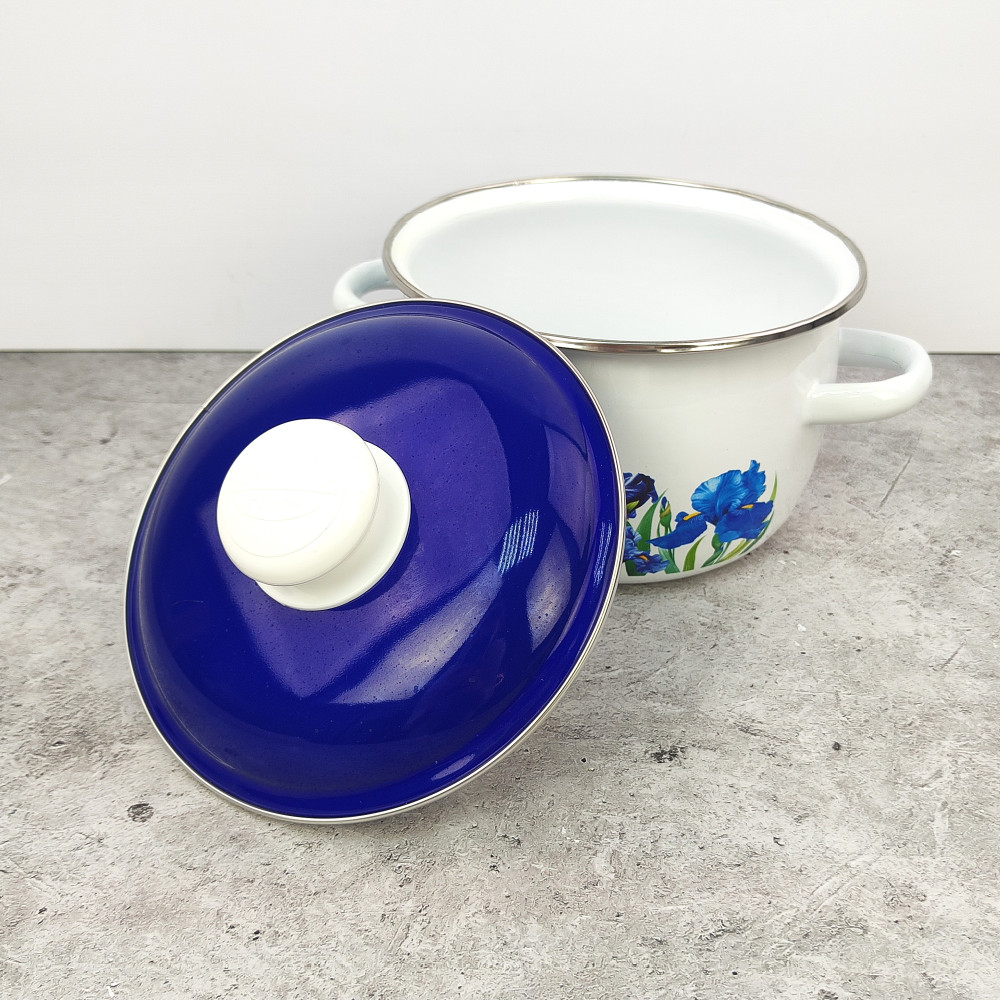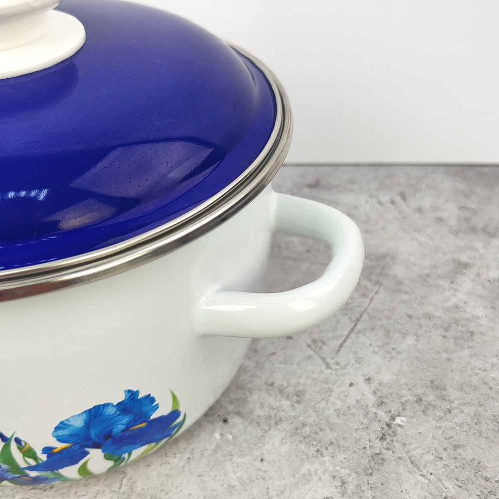 Кастрюля эмалированная 2 л кнопка ободок белый крышка кобальтовая Ирисы Стальэмаль
