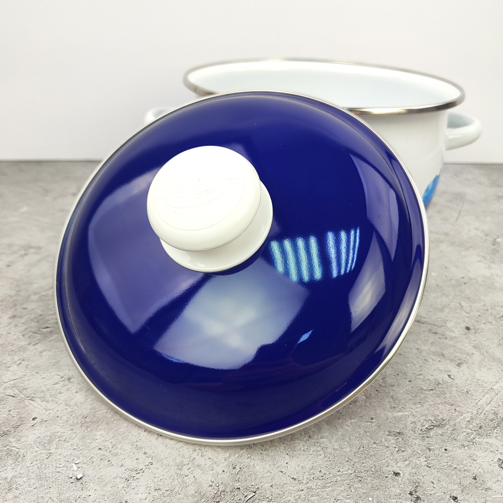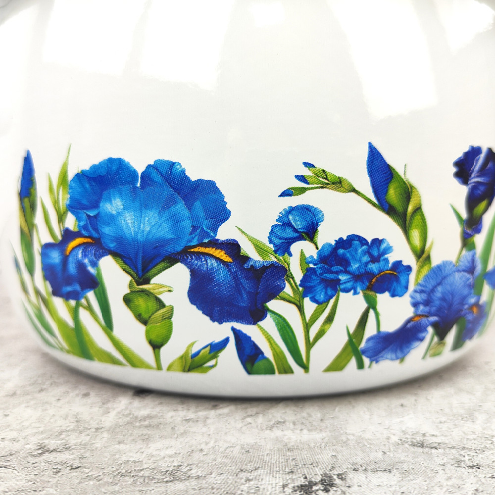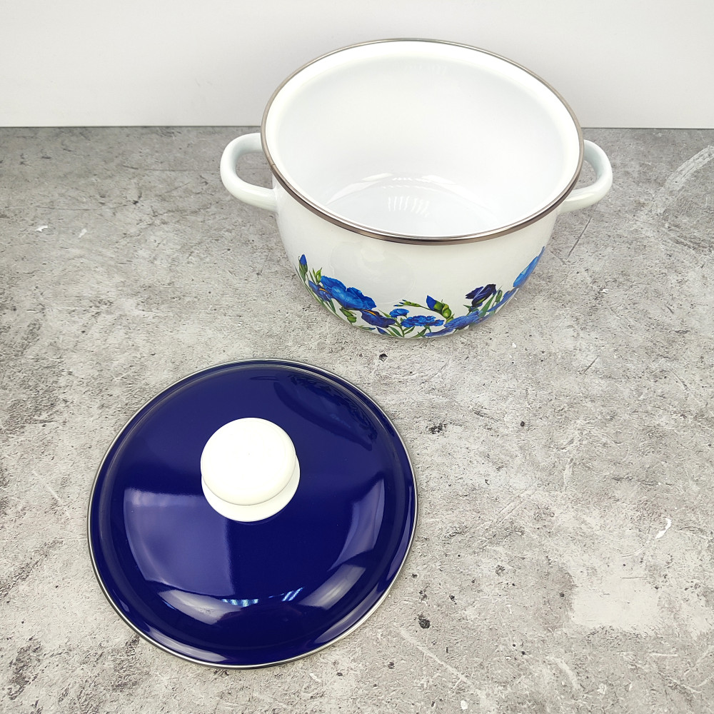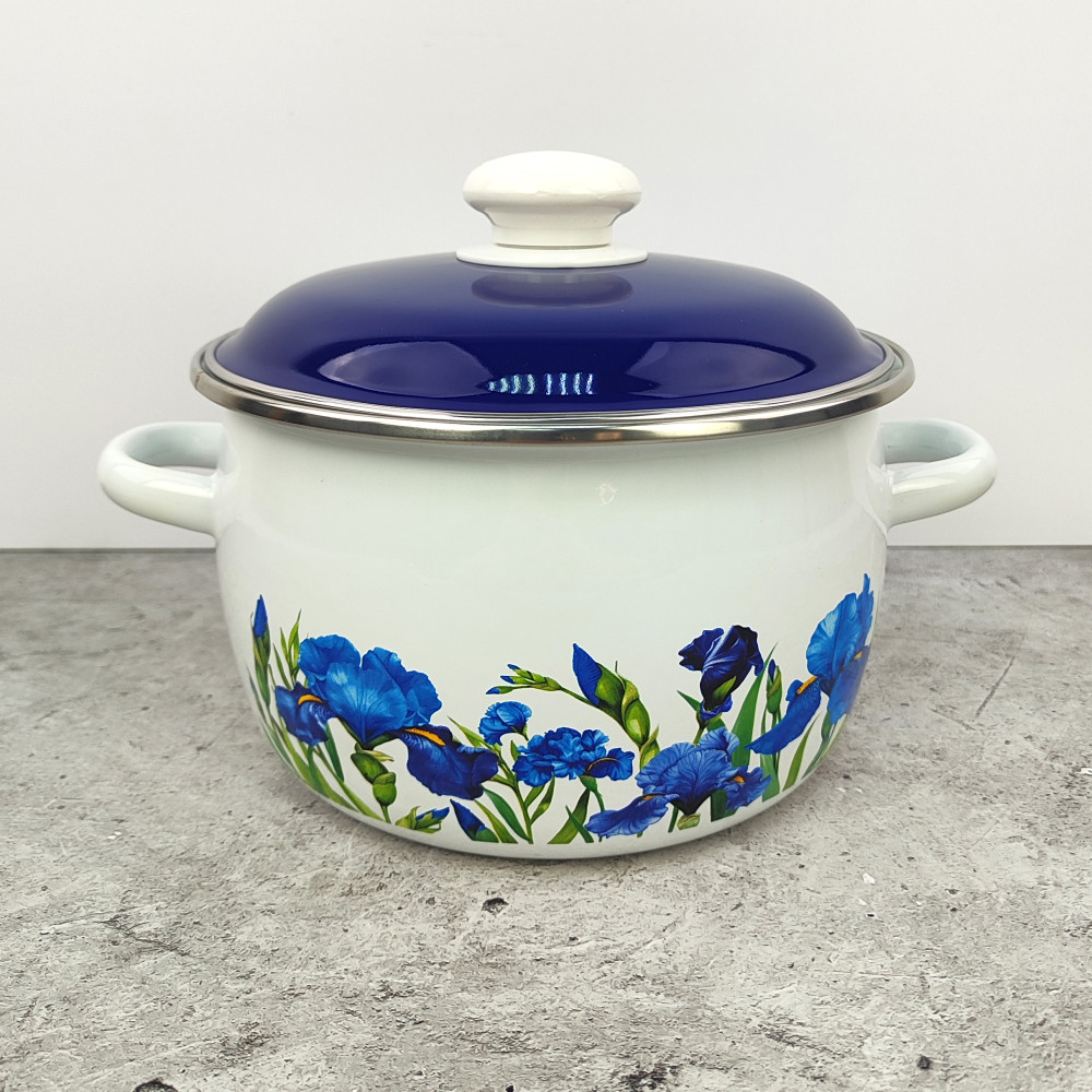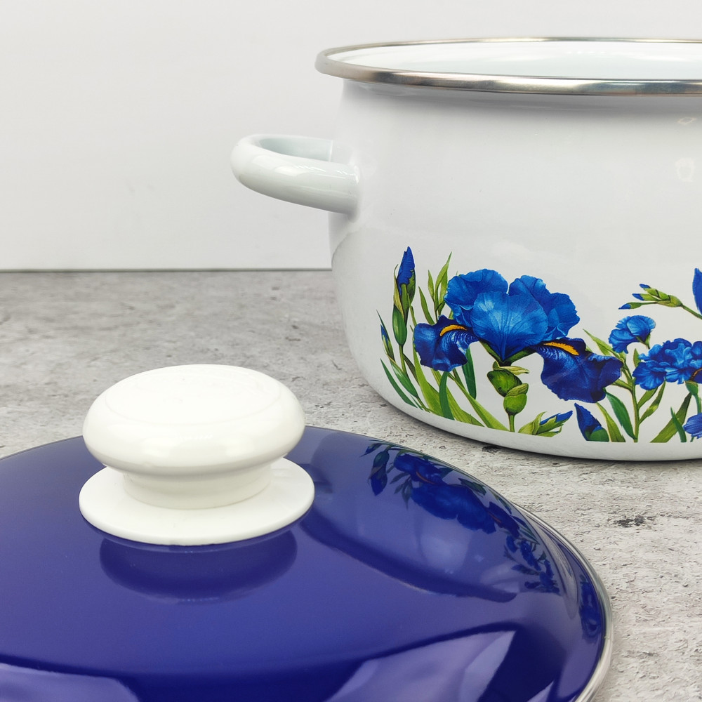 Кастрюля эмалированная 3 л пласт кнопка ободок кобальт крышка белый Ирисы Стальэмаль
