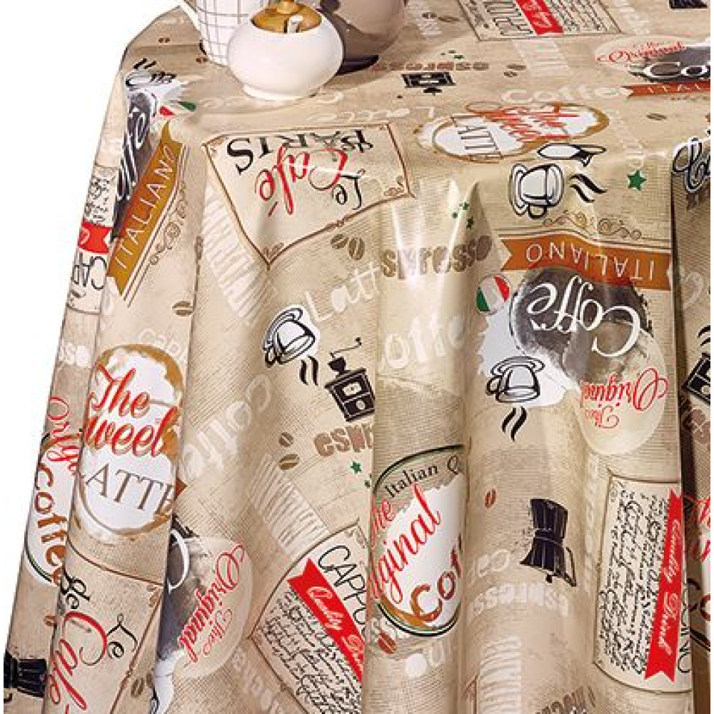 Клеенка ПВХ нетканая основа 1,4*20 м кофейные мотивы на бежевом рис 099A Dekorama
