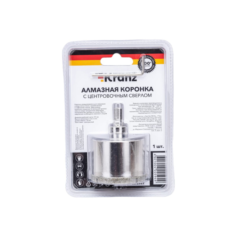 Коронка алмазная по стеклу и кафелю 55мм с центровочным сверлом KRANZ