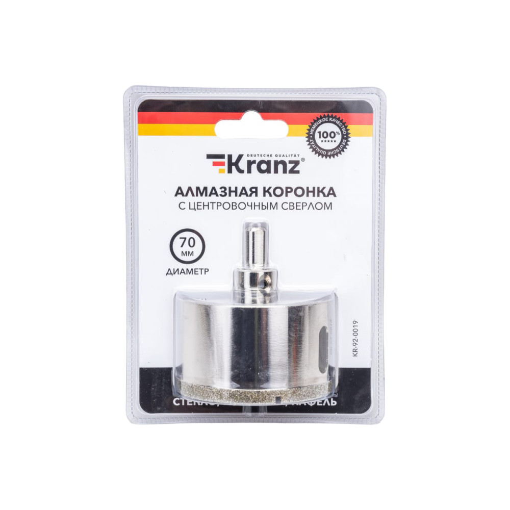 Коронка алмазная по стеклу и кафелю 70мм с центровочным сверлом Kranz