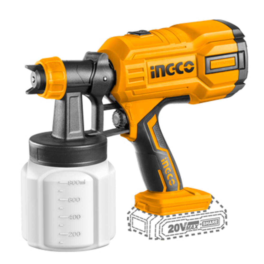 Краскопульт аккумуляторный INGCO 20В, 2.0 Ah, емкость 0,8л, макс вяз. 30 DIN CSGLI20406