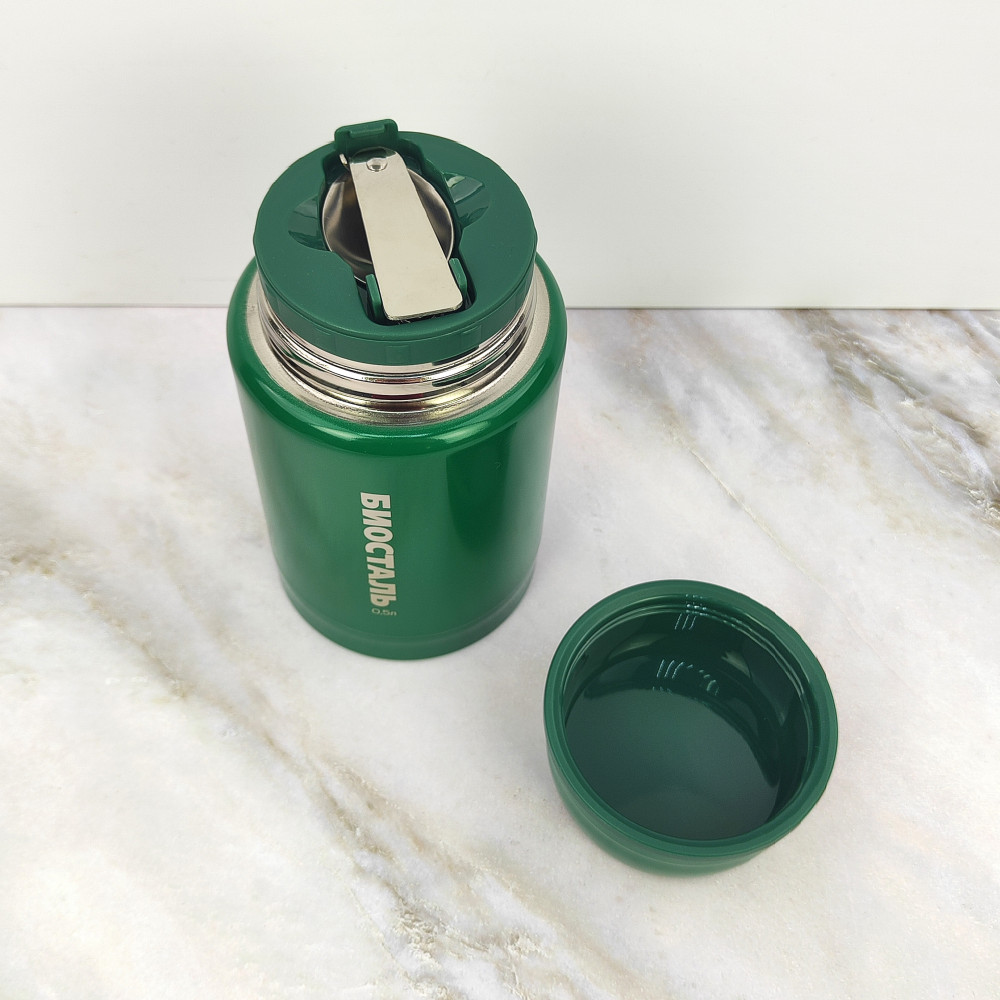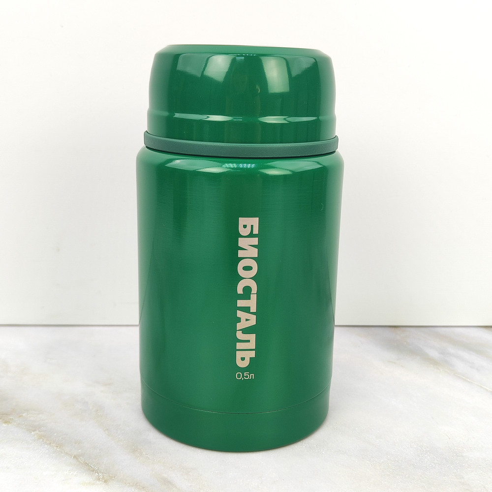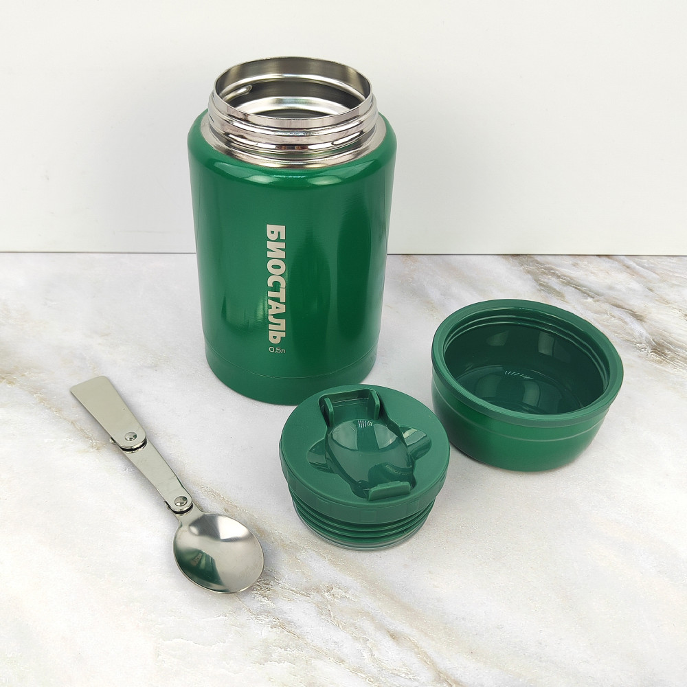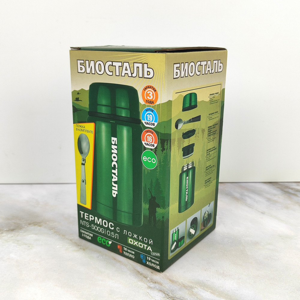 Термос нержавеющая сталь 0,5 л широкое горло ложка зеленый Охота Биосталь