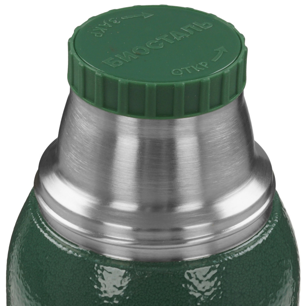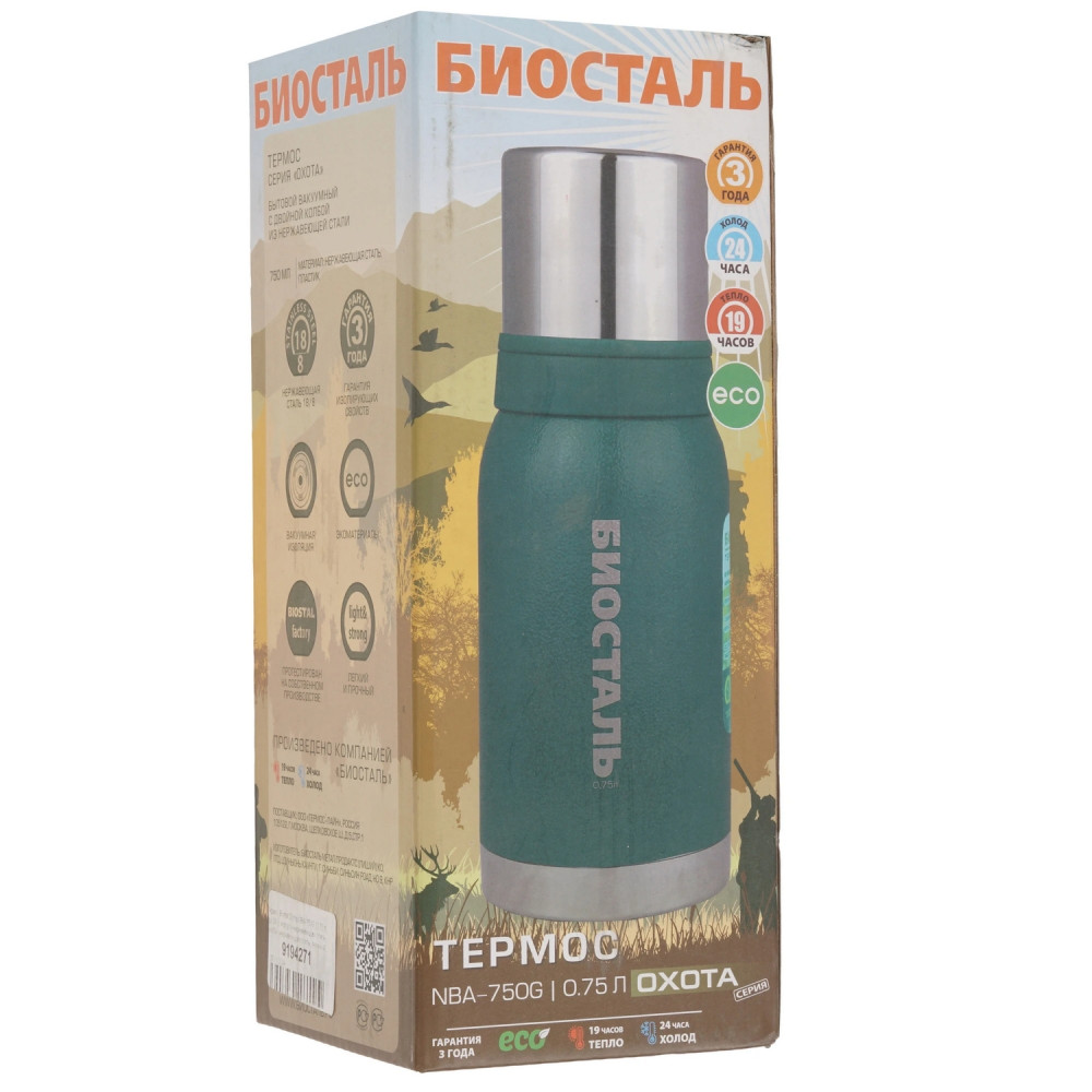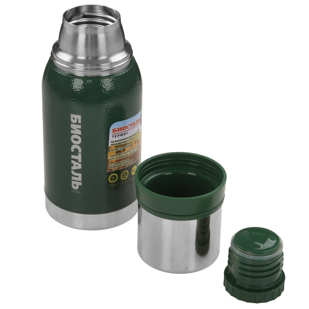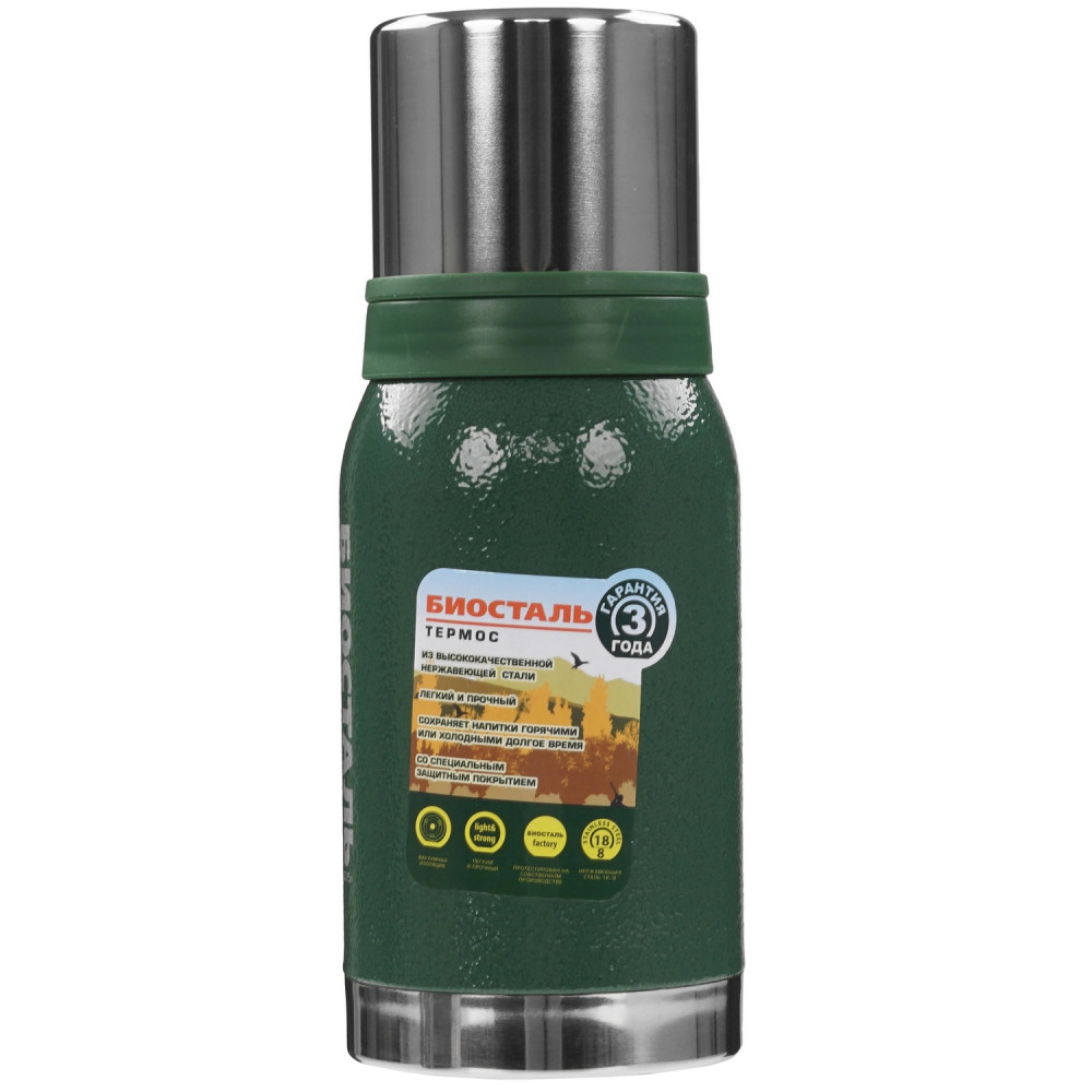 Термос нержавеющая сталь 0,75 л узкое горло 2 чаши без кнопки зеленый Охота Биосталь
