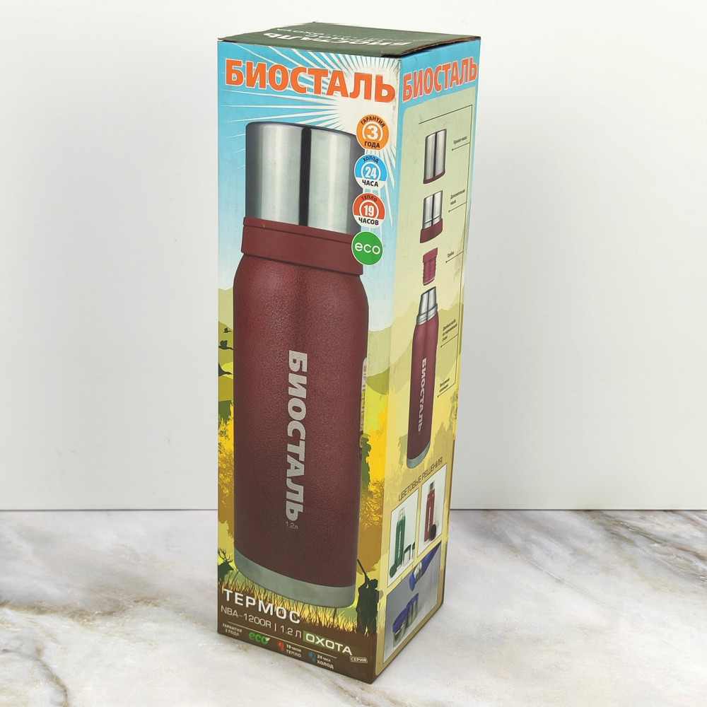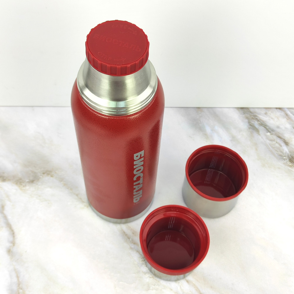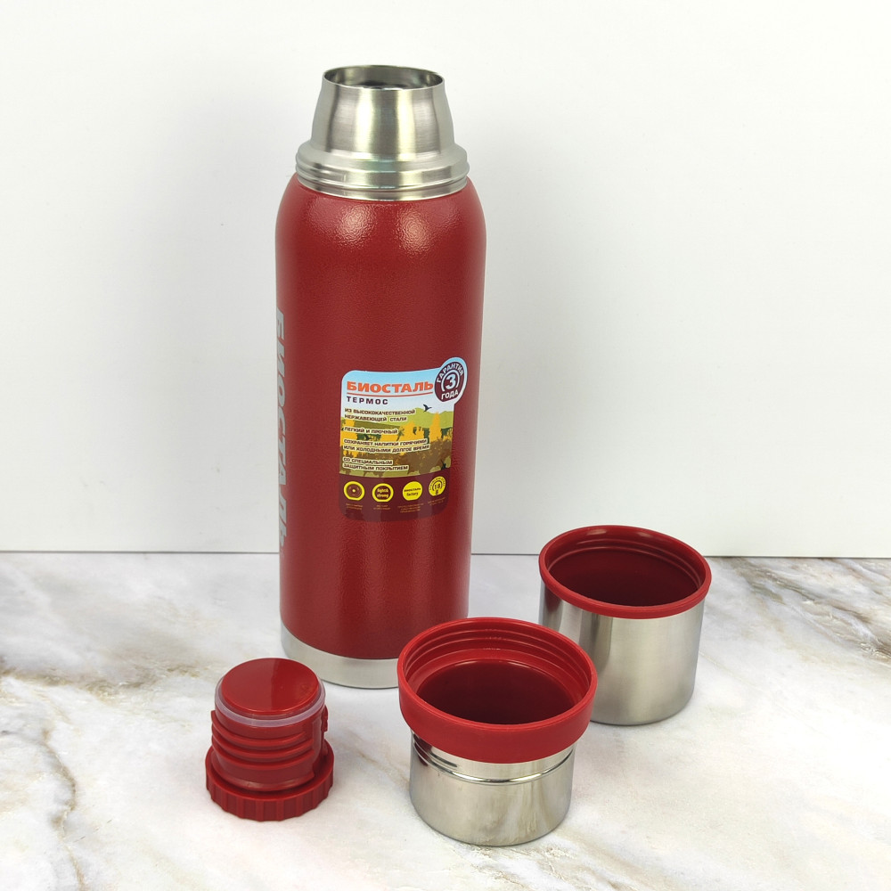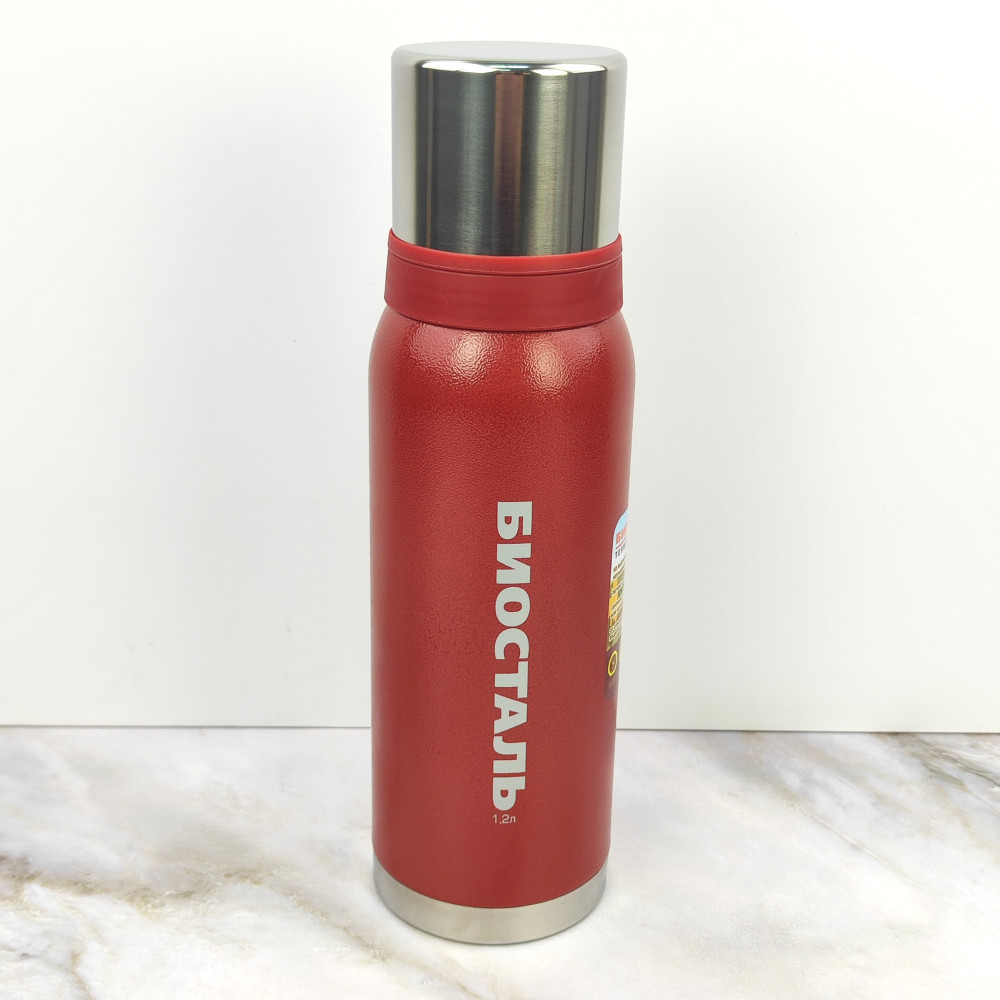 Термос нержавеющая сталь 1,2 л узкое горло 2 чаши без кнопки красный Охота Биосталь
