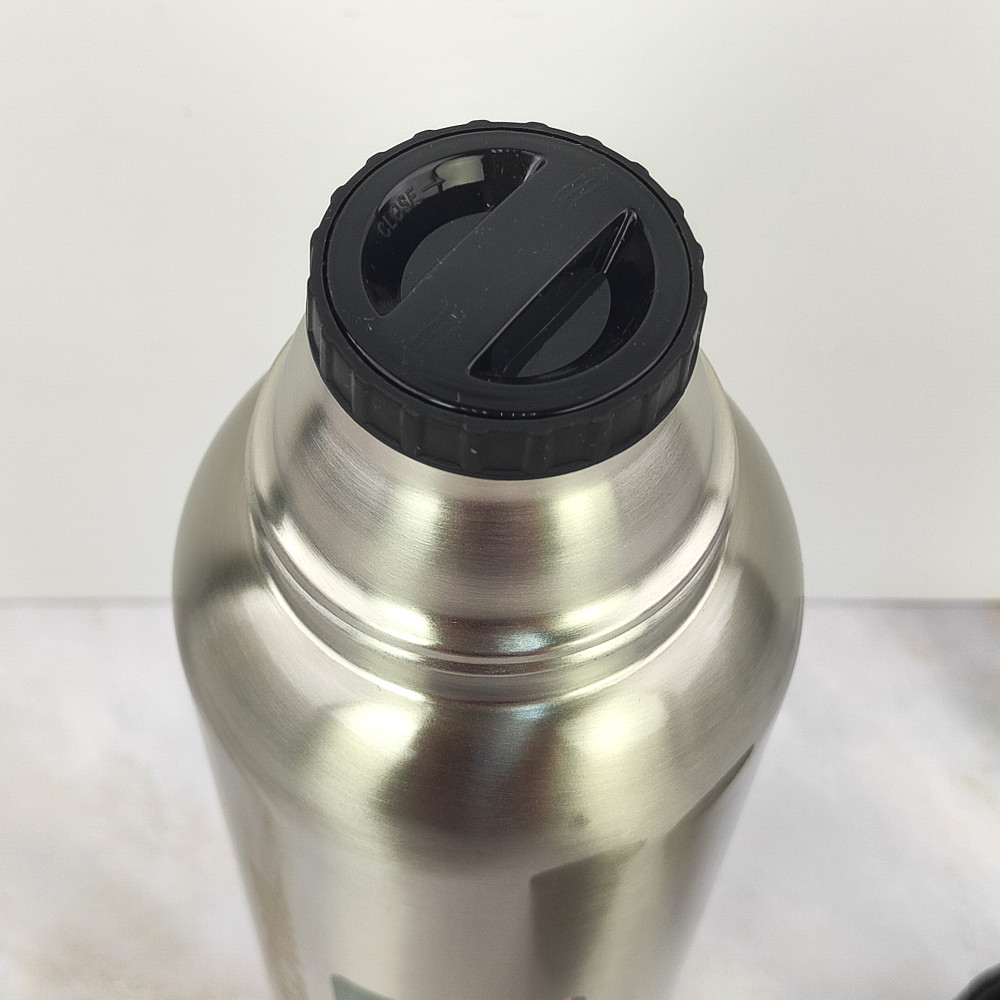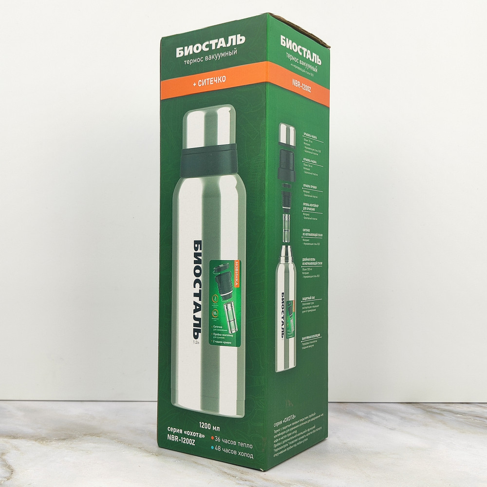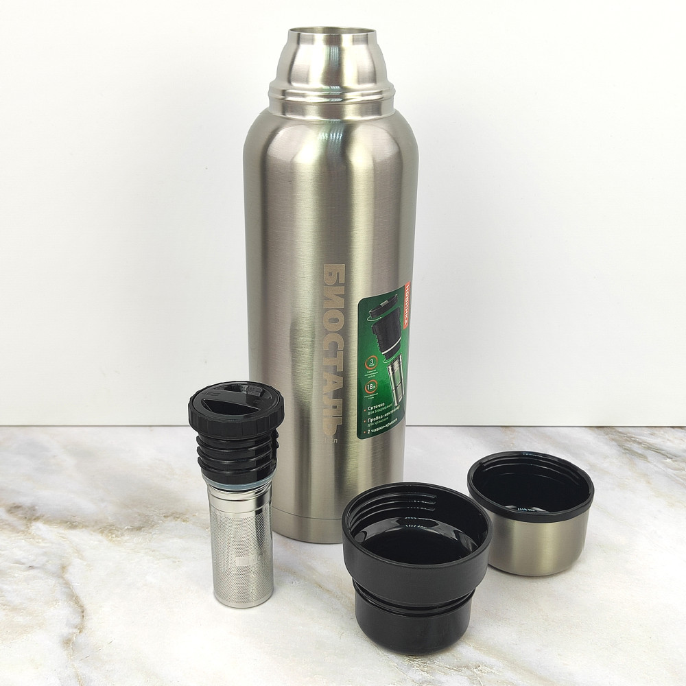 Термос нерж сталь 1,2 л узкое горло 2 чашки пробка сито без кнопки Охота Биосталь