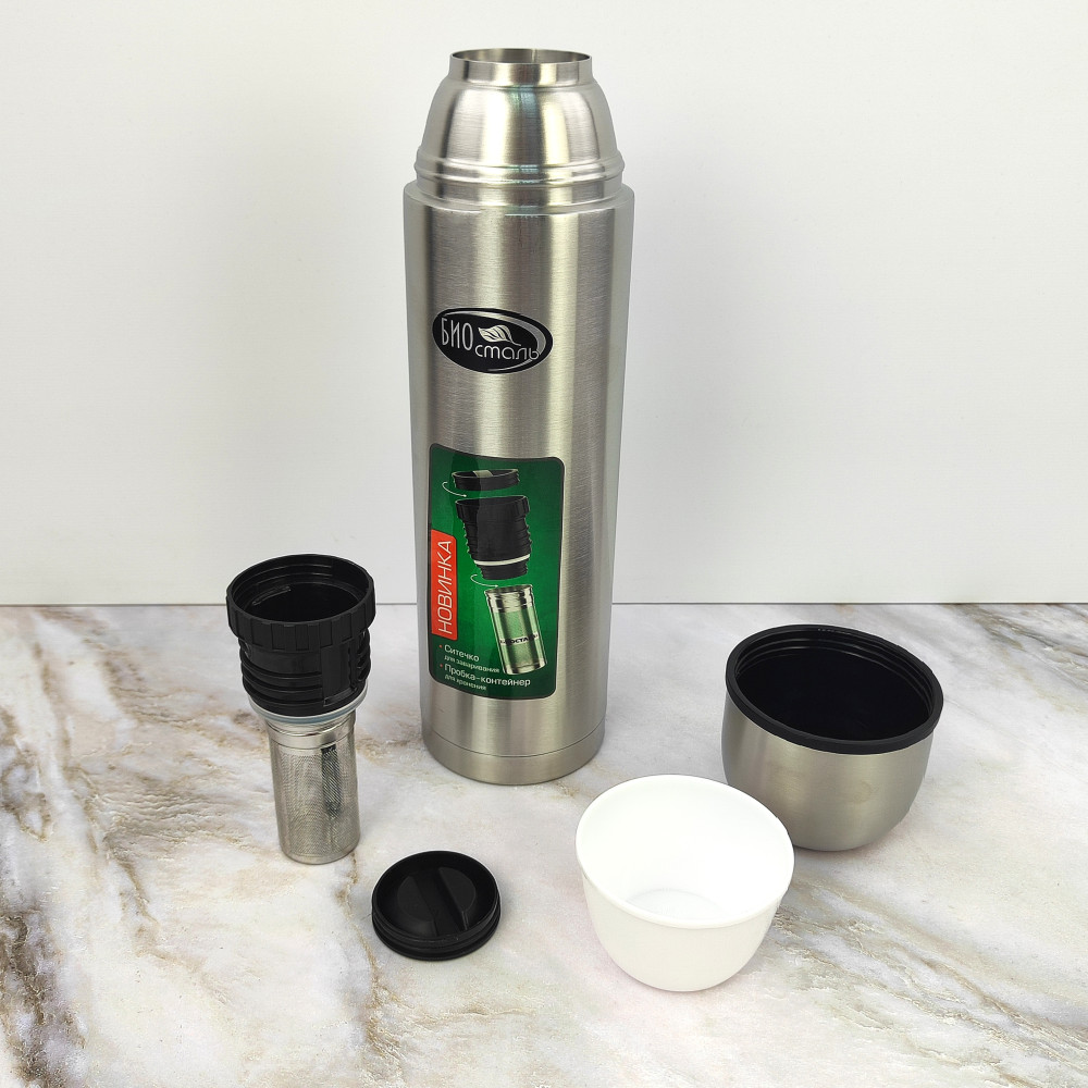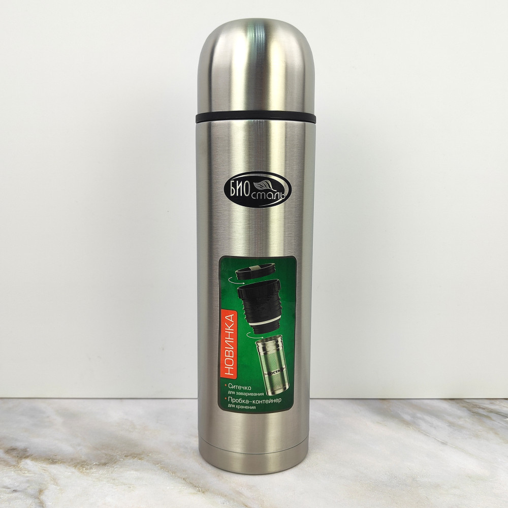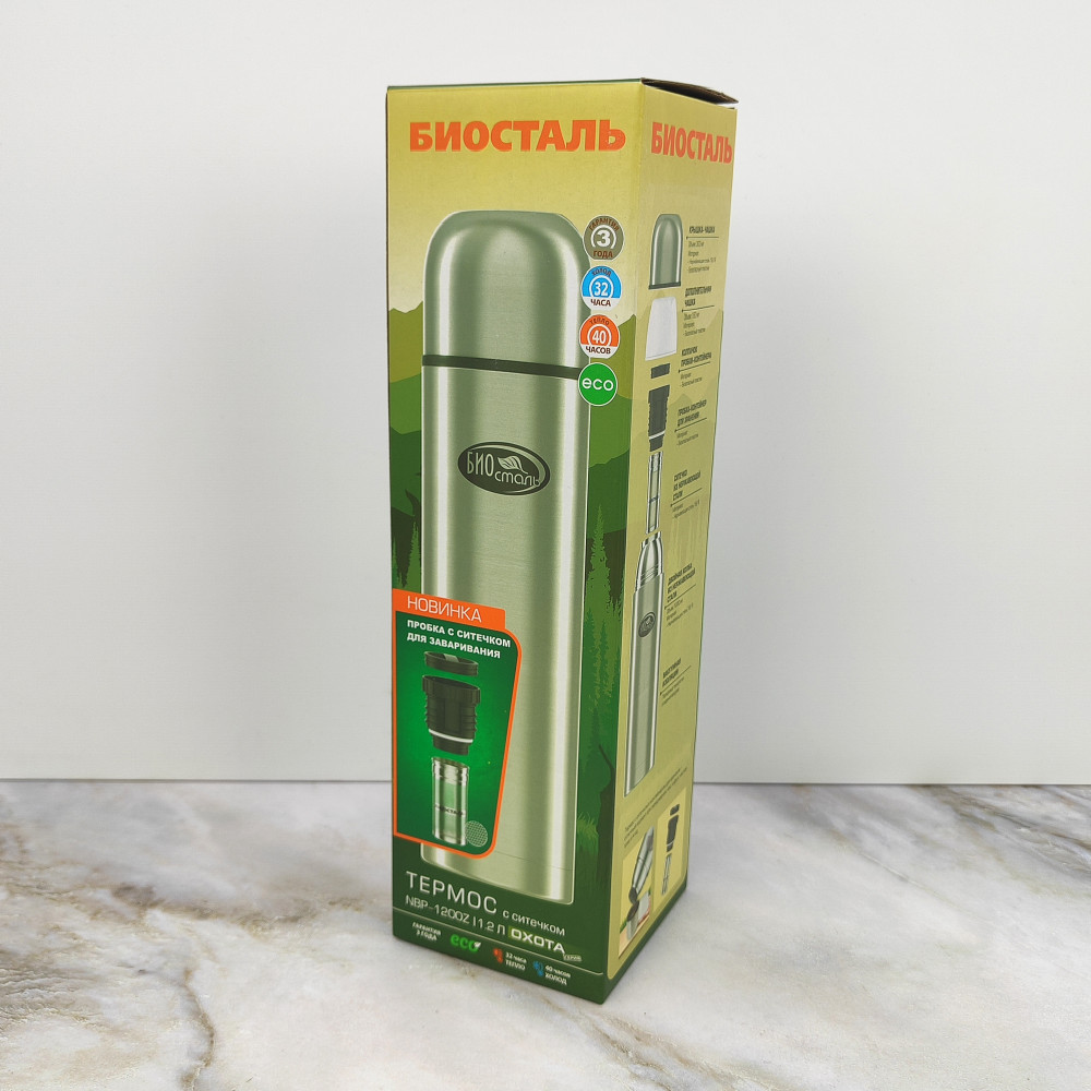 Термос нержавеющая сталь 1,2 л узкое горло пробка сито без кнопки Охота Биосталь